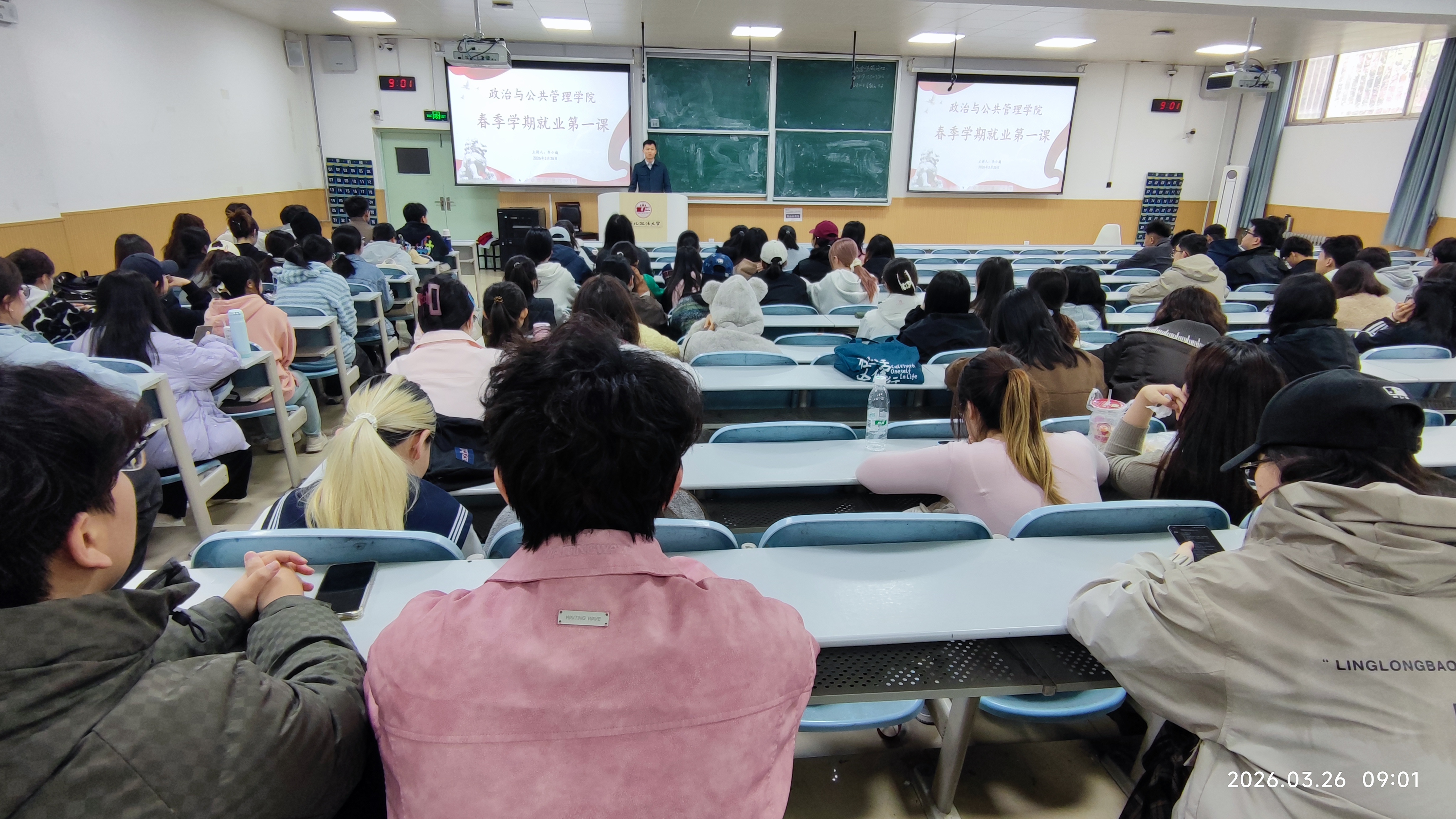 为引导学生树立正确的就业择业观,督促学生抓住春季学期开学初的关键窗口期,提前规划未来发展,3月26日,政治与公共管理学院书记李小巍为2022级、2023级本科生讲授就业第一课。 课堂围绕就业升学形势分析、发展路径梳理、阶段准备要点展开讲解。课堂通过分析全国及学院近三年毕业生数据,明晰当前就业升学竞争态势,系统梳理了升学深造、考公考编、政策就业、市场求职四大发展路径,并针对各路径给出精准可落地的准备建议,明确不同方向的核心备考与实践任务。同时,李小巍对同学们提出三点期望:坚定方向做有目标的奋进者,锤炼本领做有实力的实干者,勇于担当做有韧劲的青年者。 学院一直高度重视学生就业工作,后期学院将通过链接资源、访企拓岗、发动校友等方式继续为学生搭建就业平台,持续加强就业指导、升学辅导、心理疏导等全方位服务,助力学生高质量充分就业。