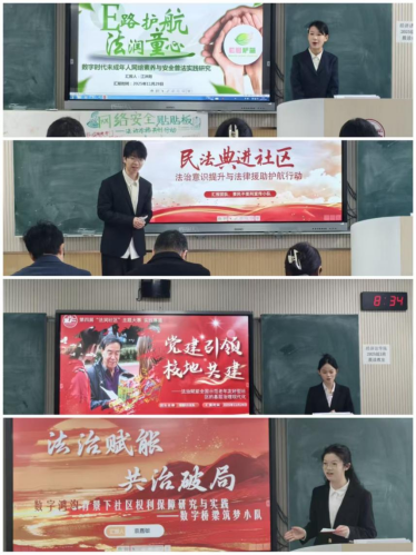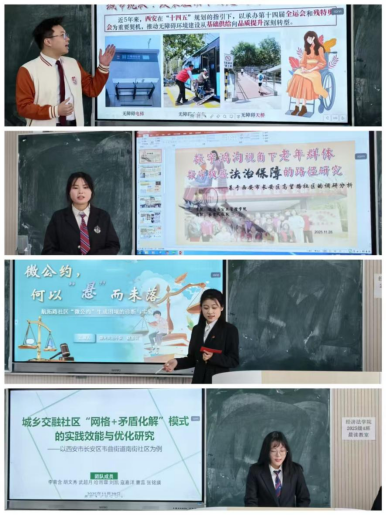 实践赛道的21支队伍紧密依托所学专业知识,积极探索新颖的活动模式,借助主题宣讲、法律咨询、法治知识竞答、模拟法庭等多元形式,将党的二十届三中全会精神与习近平法治思想有效传递至社区各个层面。在成果展示环节,各队通过详实的讲解与鲜活的视频记录,系统呈现了“法润社区”系列实践的全过程与显著成效。评委老师围绕活动设计的创新性、对社区法治建设的推动作用,以及居民法治素养的提升效果等方面,对各参赛队伍进行了多维度点评与综合评判。